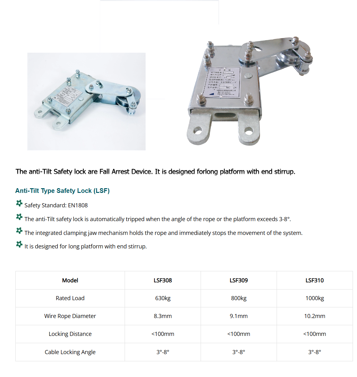 Overspeed safety lock operates automatically. It consists essentially of a clamping jaw mechanism and a centrifugal governor, which permanently checks the speed of the wire rope passing through the LSL. The jaw mechanism automatically clamps onto the wire rope when there is a sudden increase in speed.